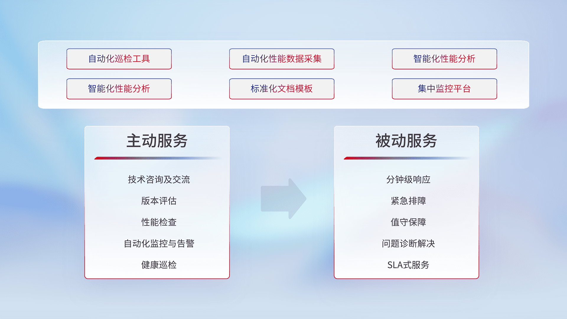 智能化工具和标准化文档,,,,保障服务质量,,,,提供主动服务(包含技术咨询、、、版本评估、、性能检查、、、自动化监控与告警、、、、健康巡检)和被动服务包含(分钟级响应、、、、紧急排障、、值守保障、、问题诊断解决、、SLA服务)。。。