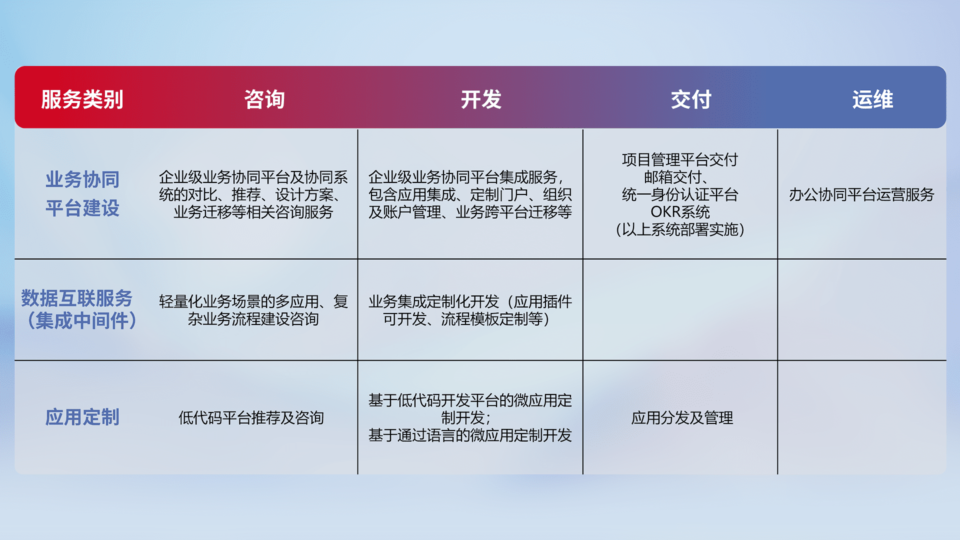 针对钉钉、、、企微、、、、IDaas等平台级产品提供产品的规划、、方案、、、交付、、定制化开发等服务,,实现如统一协同办公、、智能客户服务、、、混合会议管理、、、、智能数据查询、、、、等业务场景,,实现数字化转型。。。。